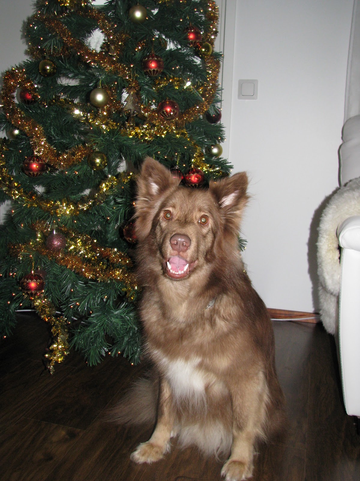 Joulusta ei sitten ole yhtään kuvaakaan, paitsi koirasta jonka lähetin kasvattajalle aamulla joulutervehdyksenä. Hermostuspäissäni miestä ja poikaa odotellessa sairaalasta menin poistamaan kaikki kuvat kamerasta. Voi että on harmittanut ja paljon. Meinasi niin mennä hermo että hyvä kun ei koko kamera lentänyt tuonne jonkkaan..